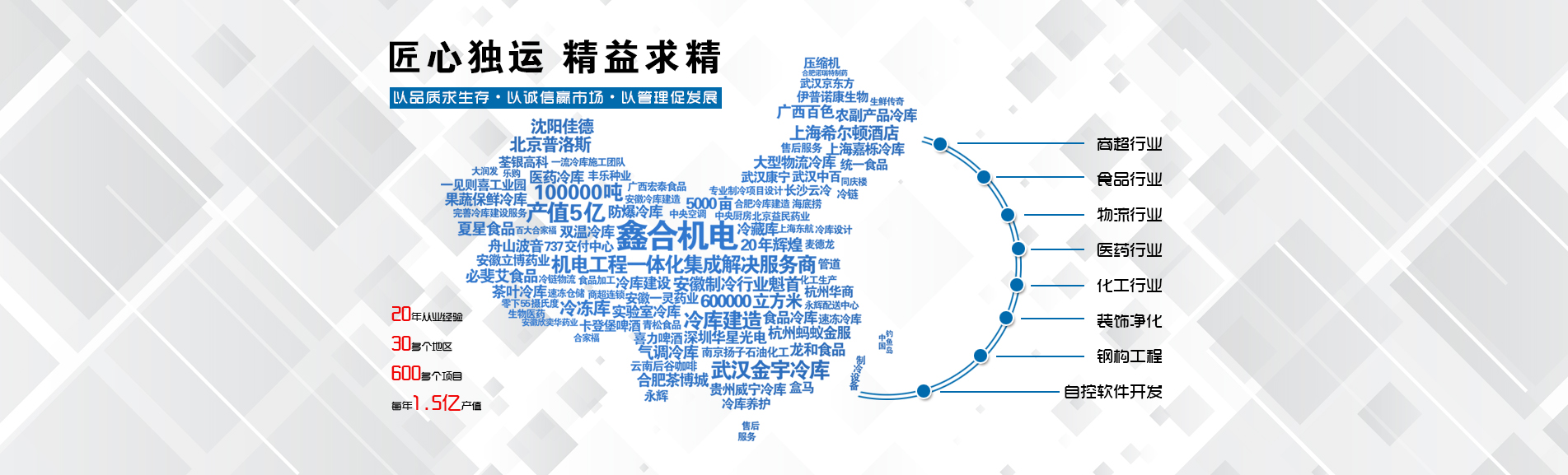 安徽鑫合機電設(shè)備有限公司于2002年組建運營,專業(yè)從事冷凍、冷藏庫、中央空調(diào)、醫(yī)藥凈化工程的規(guī)劃設(shè)計、施工承建、售后服務(wù)為一體的綜合性工程公司,與100多家實力雄厚的大中型企業(yè)建立長期產(chǎn)略合作關(guān)系,其中有多家世界500強和上市企業(yè)。公司作為中國倉儲與配送協(xié)會會員單位、安徽省制冷學(xué)會理事單位、上海楊浦區(qū)制冷協(xié)會工程總承包負(fù)責(zé)單位,引領(lǐng)于行業(yè)前沿。我們將銘記給予我們大力支持的各界新老朋友及合作伙伴,我們將會保持“互惠互利、共同發(fā)展”的原則與您共創(chuàng)雙嬴的合作關(guān)系。